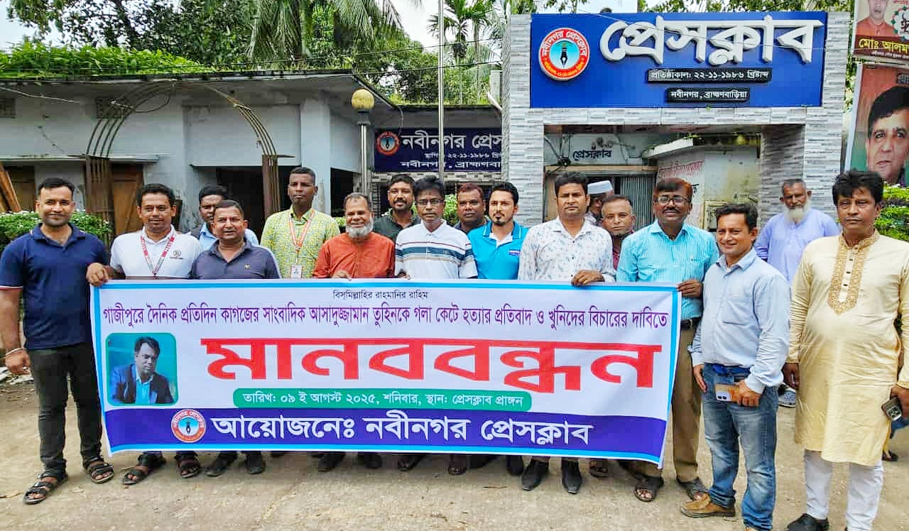 নবীনগরে সাংবাদিক আসাদুজ্জামান তুহিন হত্যার বিচারের দাবিতে মানববন্ধন অনুষ্ঠিত।