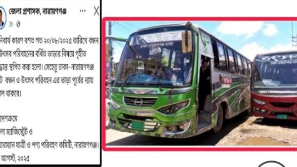 স্টাফ রিপোর্টারঃ তীব্র সমালোচনা, বিরোধীতা ও প্রতিবাদের মুখে ঢাকা-নারায়ণগঞ্জ পথে বর্ধিত ৫ টাকা বাসভাড়ার সিদ্ধান্ত প্রত্যাহার করে পূর্বের মতো ৫০ টাকা রাখার ঘোষণা দিয়েছেন নারায়ণগঞ্জ জেলা প্রশাসক মোহাম্মদ জাহিদুল ইসলাম